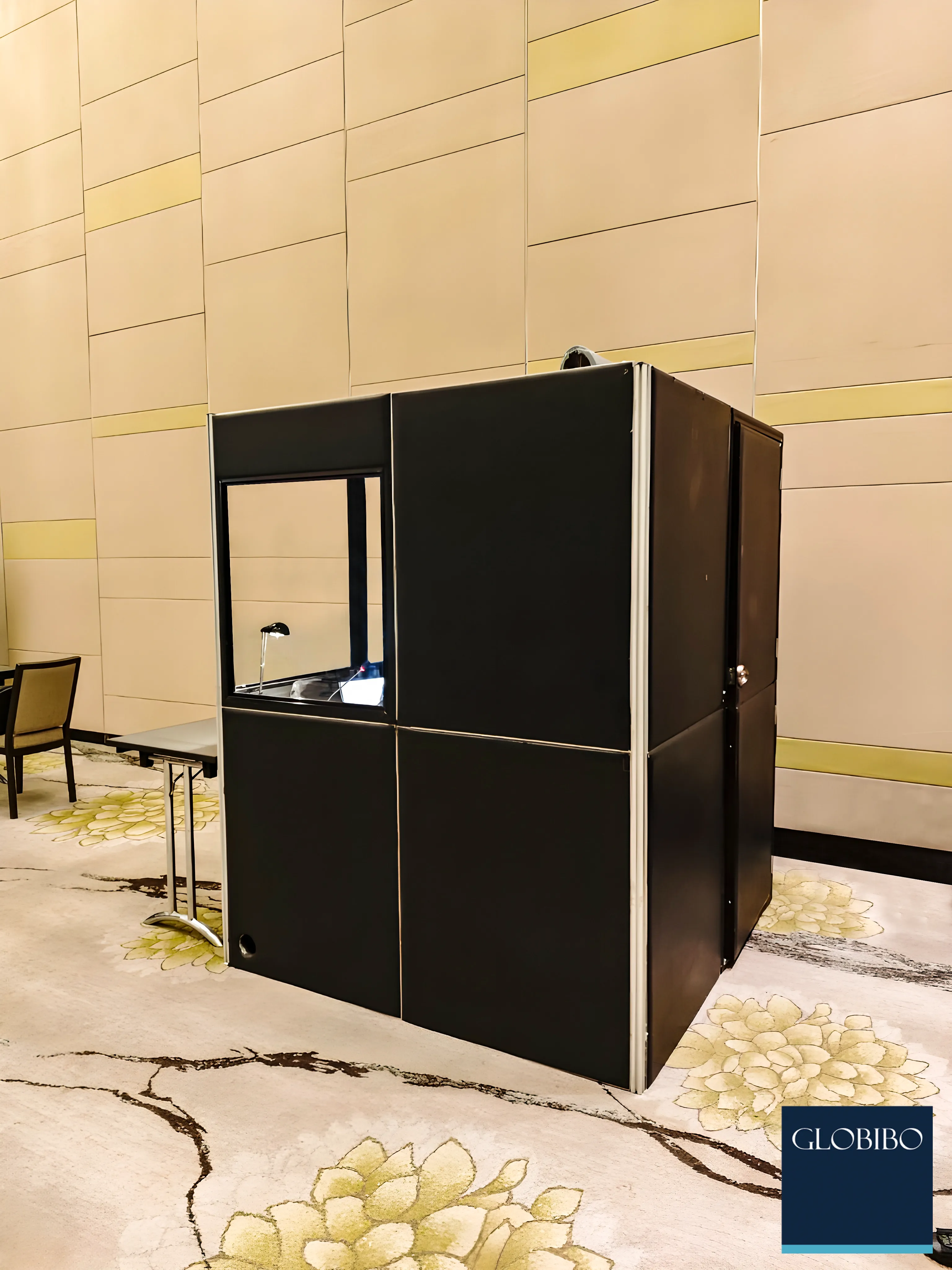 The portable interpreter booth provides working accommodation for one, two, three, or four interpreters. The whole booth can be assembled by means of hook fastenings. The dimensions and weights of the individual modules make it possible to transport and assemble the booth by one person only. The vertical modules are made of a robust outer hardwood frame, which surrounds a central panel made of soundproofing laminate material. The booth is designed to take two low-noise tangential fans, ensuring an adequate amount of air is circulating in the booth. In addition, two reading lamps are provided for each booth